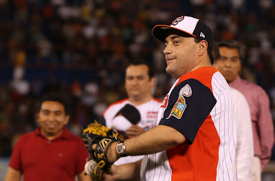 | Roberto Borge Angulo, gobernador de Quintana Roo lanzando la primera bola en el juego inaugural de la Liga Mexicana de Béisbol, Temporada 2013 |